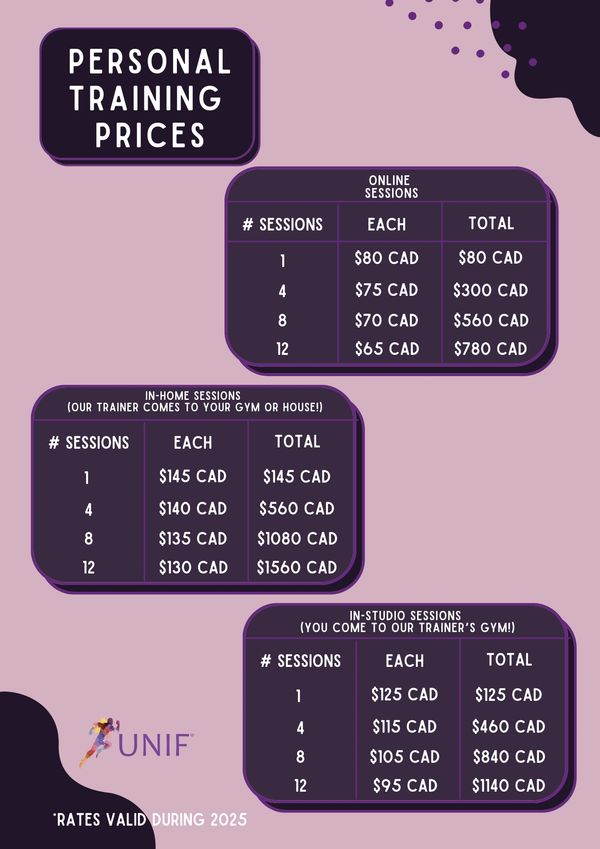 In-Home Sessions: Available only within Toronto. Clients must provide access to a condo/gym facility and cover any related fees.